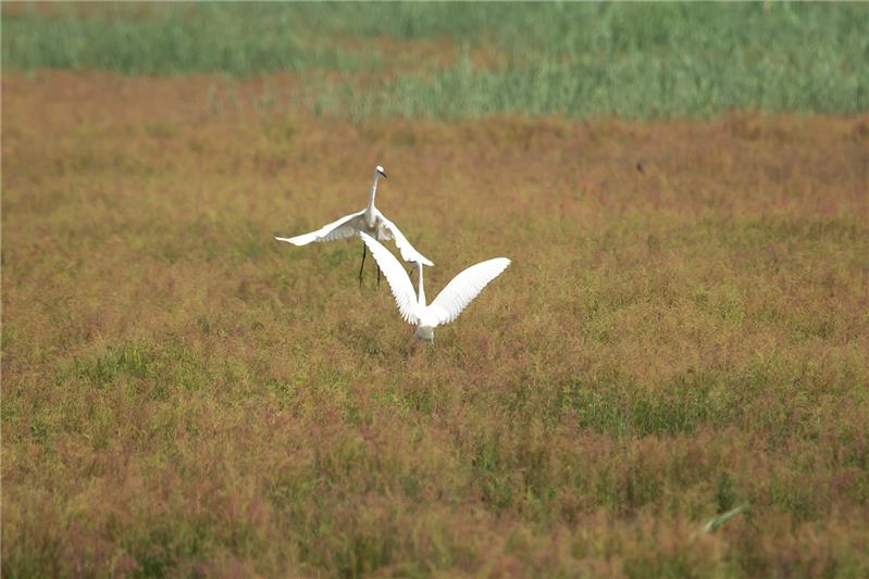 《白鹭嘻戏红草地》