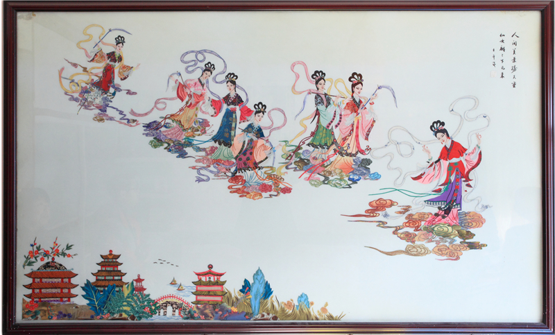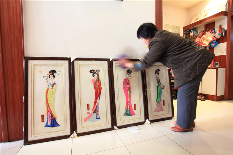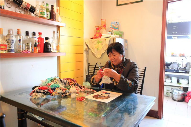 一堆碎布头、一把剪刀、自制环保胶水、一把钢锥、一张白卡纸,就是这些看似再普通不过、再简单不过的工具,在姚念花的巧手下可以变幻成七仙女、梅兰竹菊、老寿星、桂林山水、山村小景甚至明星漫像,人像、动物无不维妙维肖,山水画卷无不明丽可人、意境深远!她的作品不仅在当地有响当当的名气,好多优秀作品甚至走出国门,被外国友人收藏!这就是济宁市非物质文化遗产--姚念花的布贴画。