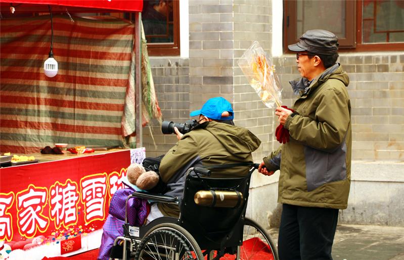 庙会上遇上父子两,父亲一手举着儿子喜欢吃的糖“画”,一只手推着轮椅,全程陪着喜欢摄影的儿子逛庙会,满满的父爱,令我感动:父爱如山!