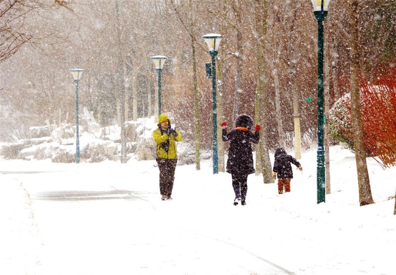 雪中,一家三口踏雪寻趣,乐在其中。拍于潍坊植物园