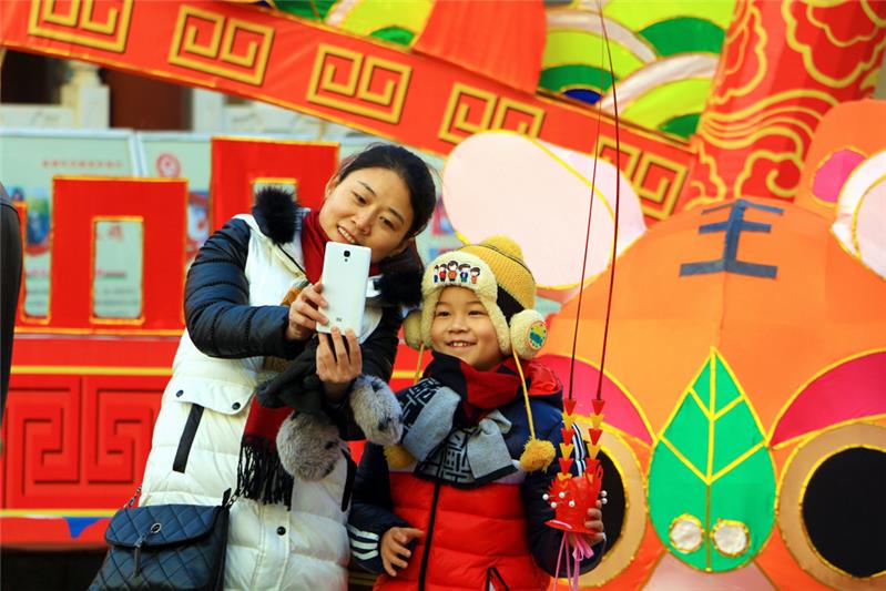 母子两在灯会前留影,母亲的微笑,孩子灿烂的笑容,多么甜蜜!