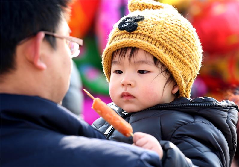 泰城街头,顽童将刚买的肉串放在爸爸嘴边让他吃第一口。