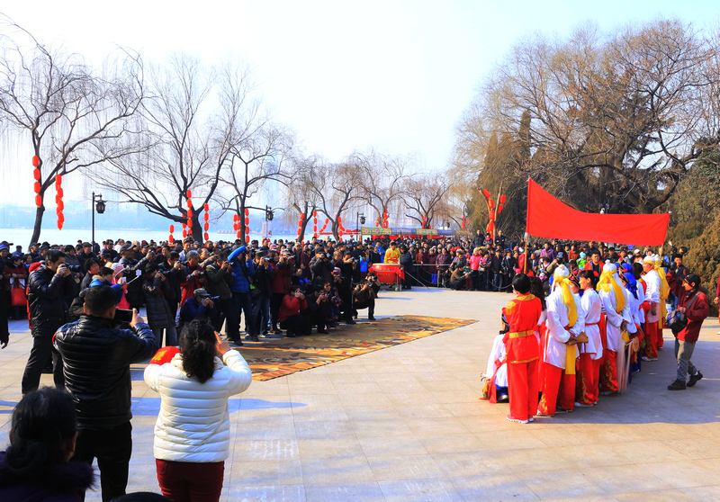 春节大明湖一队鼓子秧歌队员接受拍照,摄影的人比受拍人还多