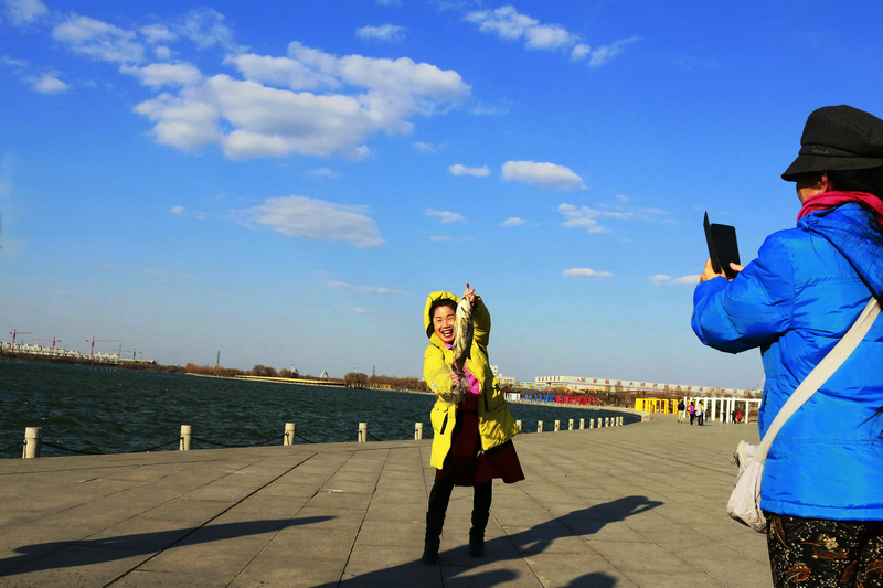 遊客在绣源河边遊玩捡到_条鱼很兴奋
