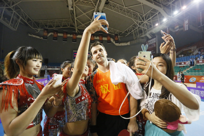 赛后,一群粉丝围拢着德国乒乓球星波尔合影留念