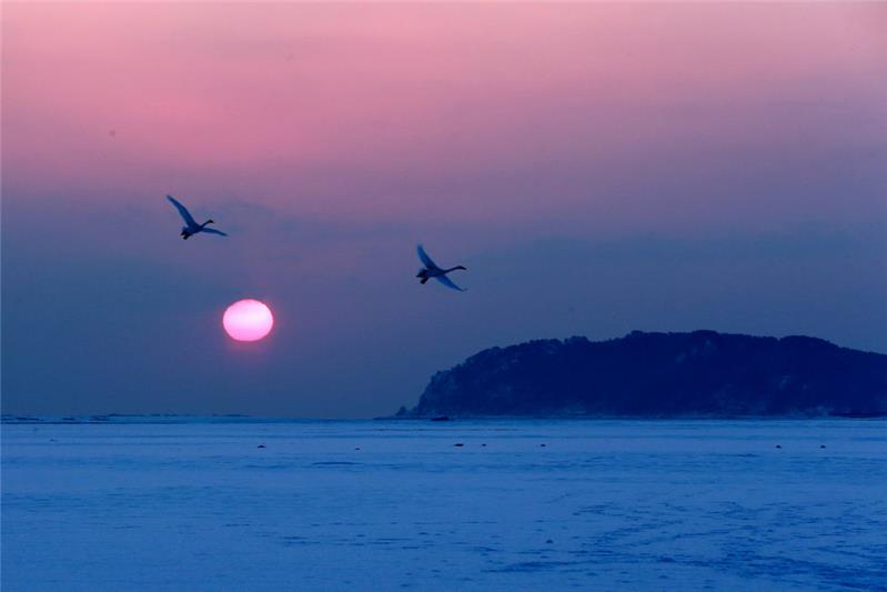 2016年1月25日,在一场暴风雪后,荣成天鹅湖再一次迎来了初升的太阳。