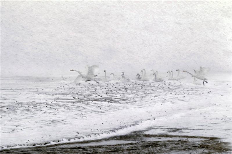 2016年1月24日,一场暴风雪袭击了荣成天鹅湖。图为顶风傲雪,展翅飞翔的天鹅。