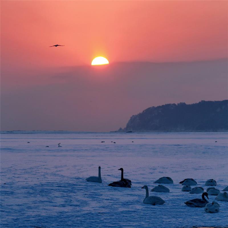 2016年1月25日,在一场暴风雪后,荣成天鹅湖再一次迎来了初升的太阳。