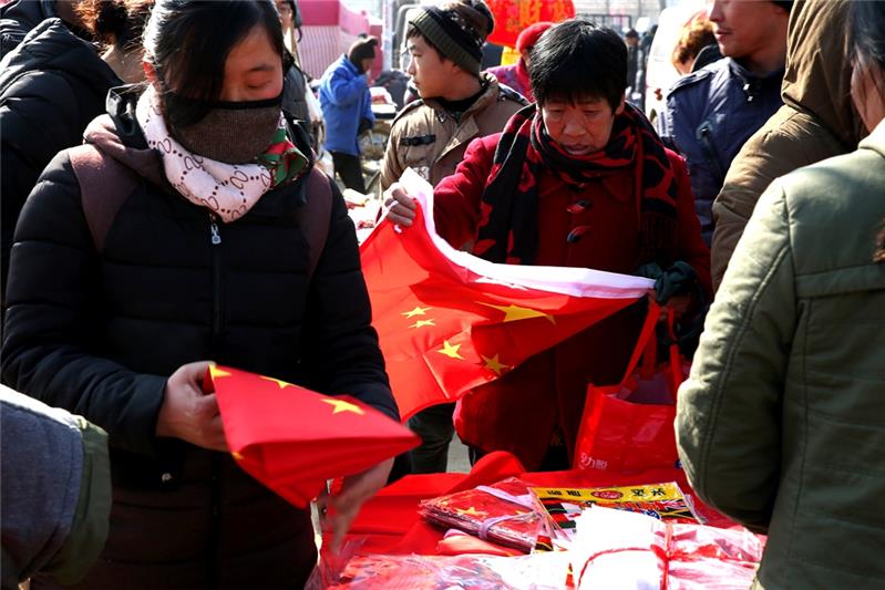 春节前夕的乡村大集市上人们正在选购一面面国旗,人们的中国梦正在逐步实现。