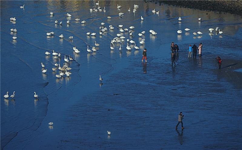 在烟墩角拍摄的人与天鹅和谐相处的场景。
