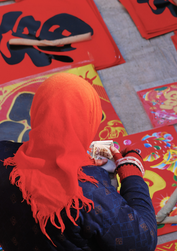 红红的头巾,红红的福字,点一点今天的收入掩饰不住内心的喜悦。