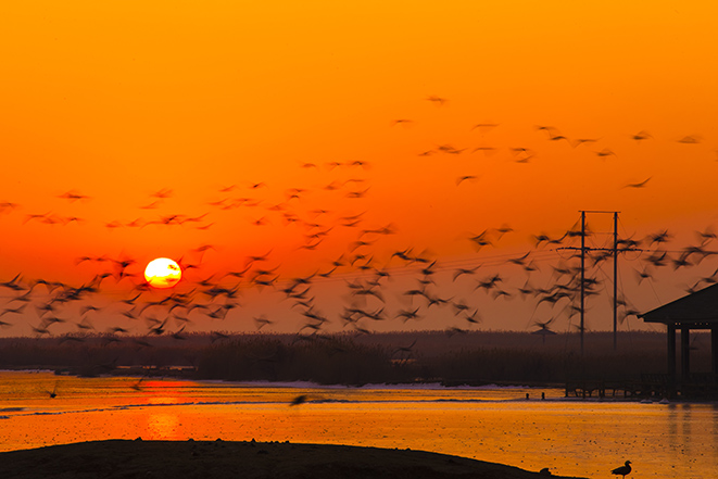 拍于东营黄河口自然保护区,一群赤麻鸭在零下15度太阳初升时起舞。