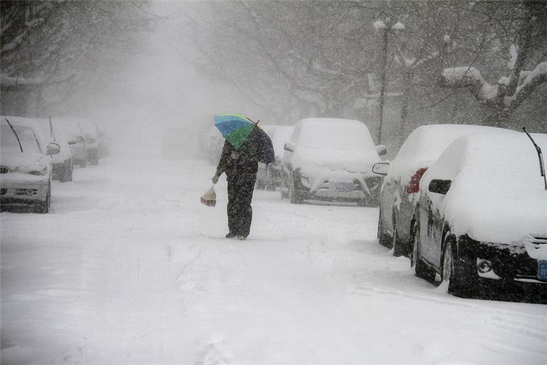 一市民冒风雪购物。摄于2016年1月威海。