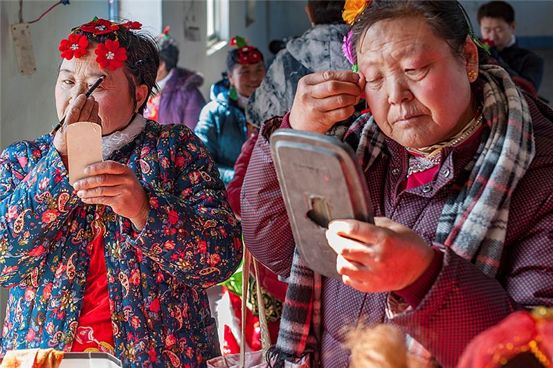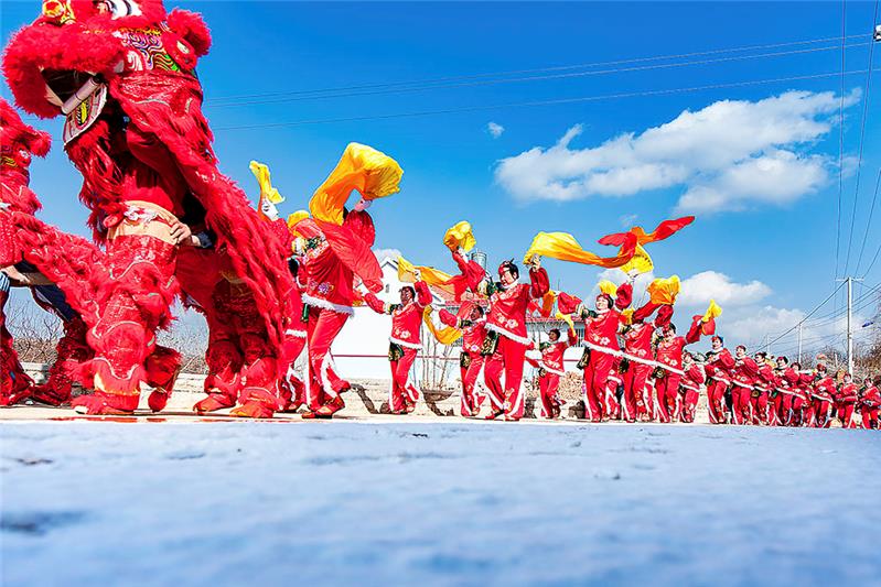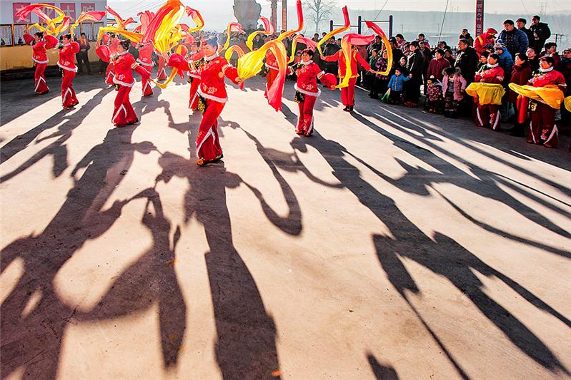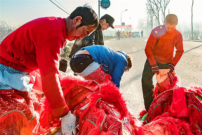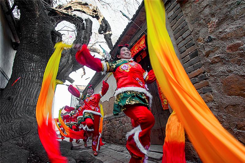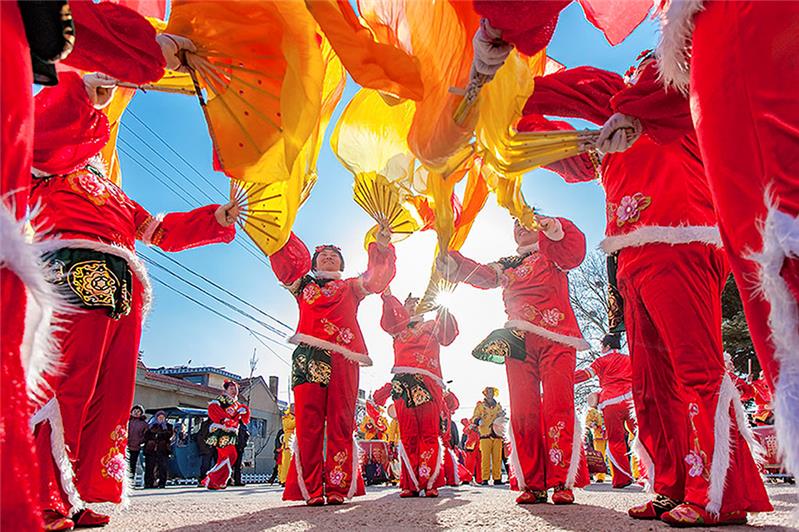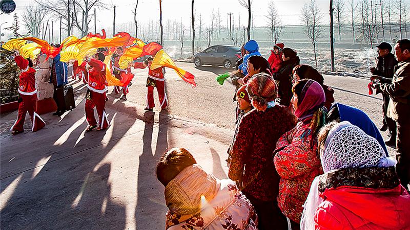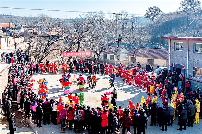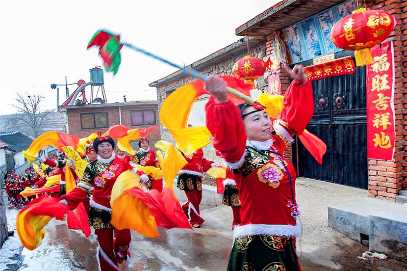 山东招远大秦家办事处苇都万家村秧歌儿队,成立于2013年。完全由爱好秧歌儿的村民自发组织成立。农闲期间,队员们自己编排,练习。每年正月,走街串巷,义务到附近村子里表演。组图为2016年春节期间,万家秧歌队演出的情景。