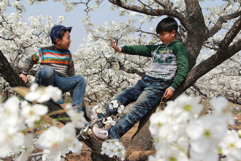 2014年3月30日拍于枣庄薛河梨乡。两名梨乡儿童正在梨花环抱的梨树上愉快地交流,真惬意啊!
