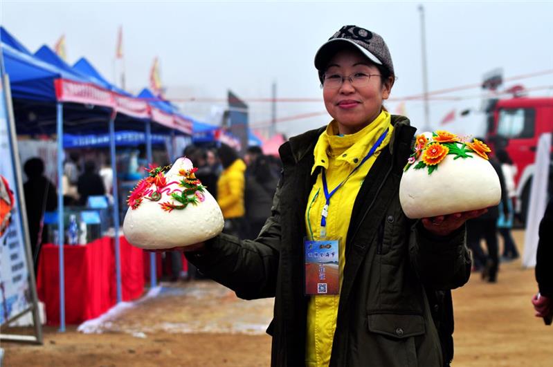 3月15日,即墨市田横旅游度假区黄龙庄村举行祭海仪式,渔民们用最原始的方式感恩大海,祈求丰收。这是工作人员展示田横花馍面塑。
