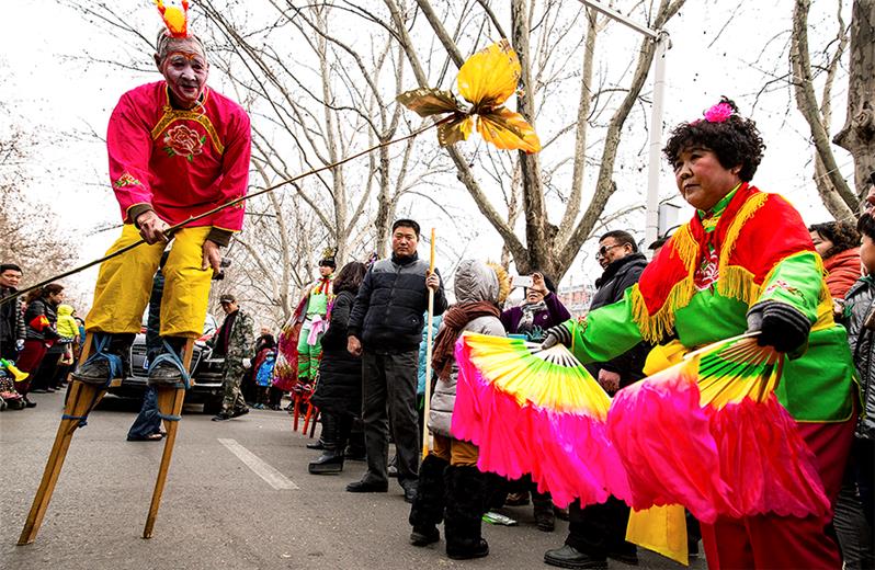 拍摄于淄博市博山区正月十五的庆元宵的拌玩队伍中,踩高跷的老人已75岁,但老当益壮,很有精神气。