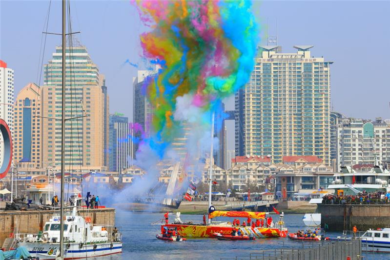3月20日,在青岛奥帆中心举办的2015-2016克利伯环球帆船赛青岛站起航仪式结束后,“青岛”号大帆船率先起航,驶出奥帆中心港湾,踏上征战美国西雅图的新赛程。