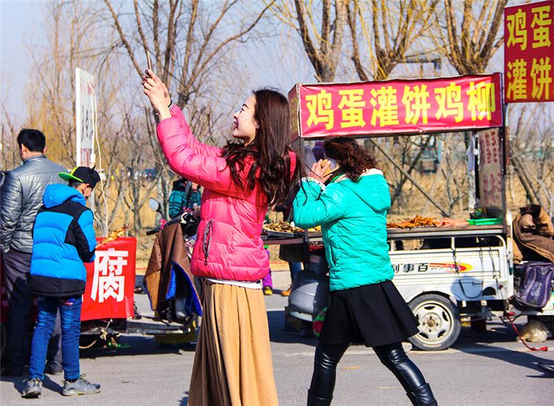 庙会上妙龄美女在自拍与周围的美食形成鲜明的对比。