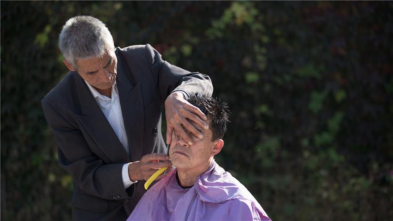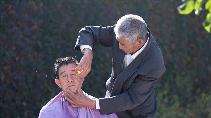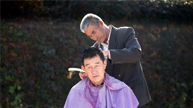 沂蒙山区采风,偶遇乡村义务理发员,老哥俩理发过程中谈笑风生,快乐温馨