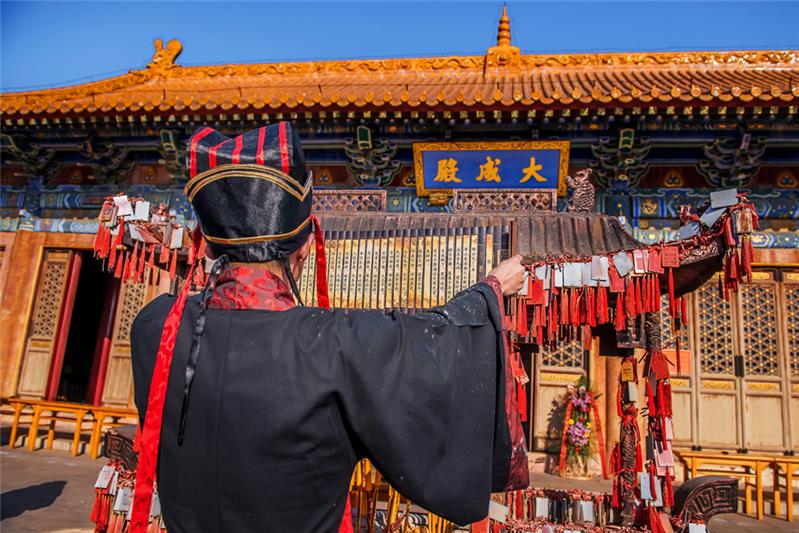 每年正月初一,都要在济南文庙祭孔祈福开笔活动,这是祭孔的一个场景。
