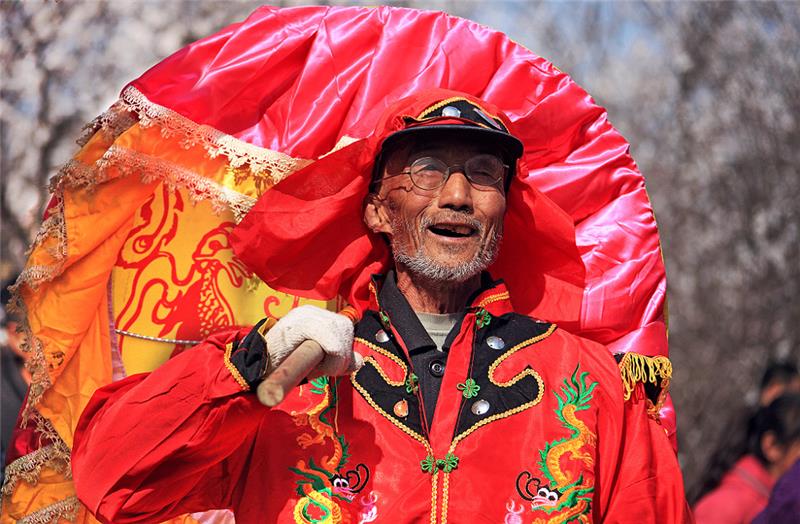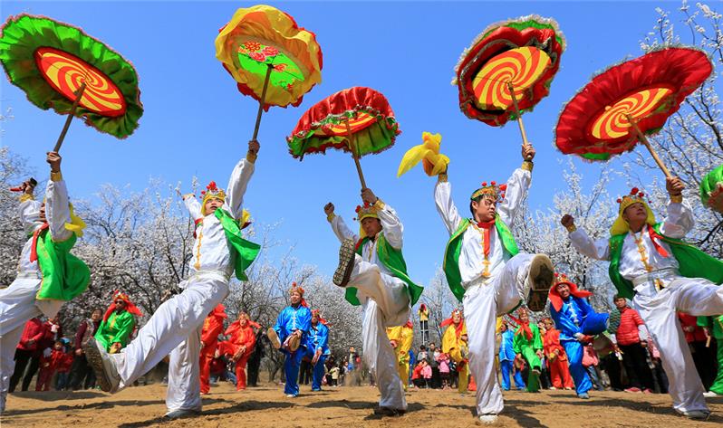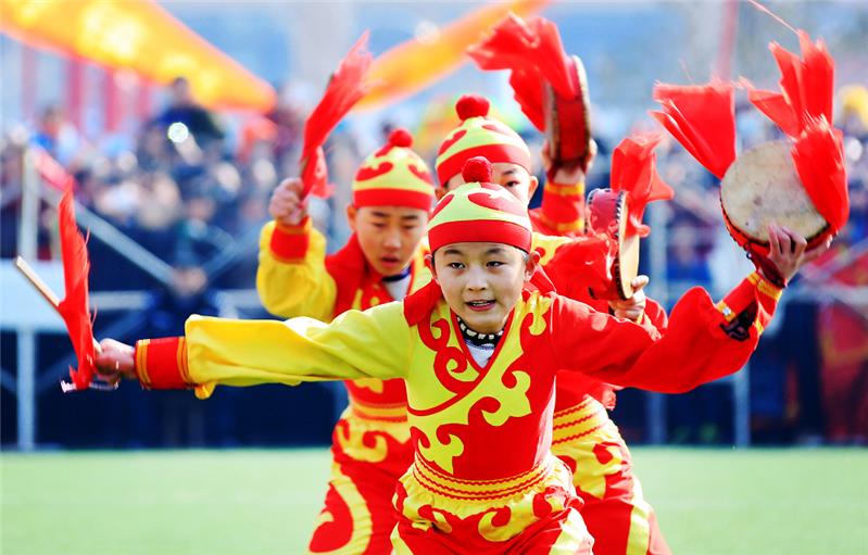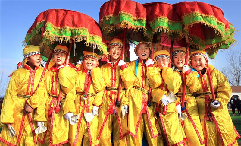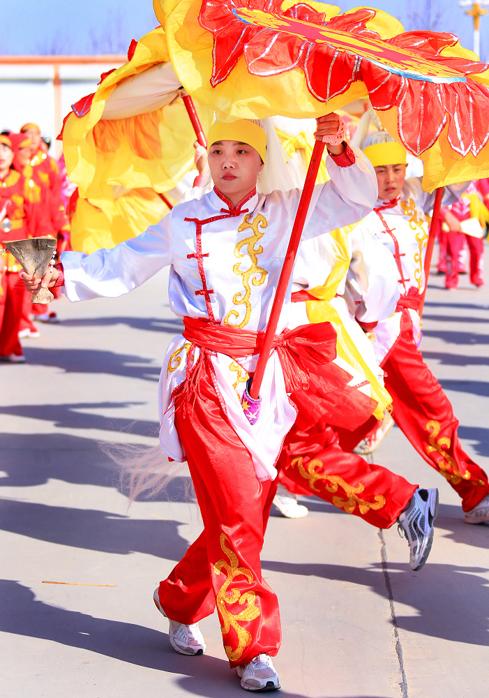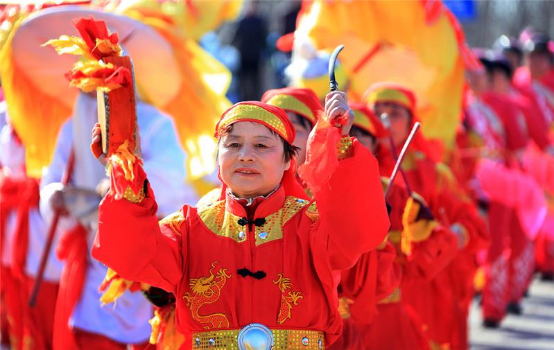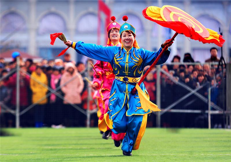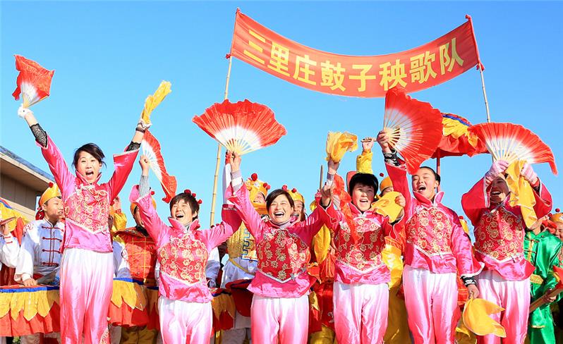 商河县的鼓子秧歌独具特色。图片表现了人们闹秧歌迎新春的欢乐场景。