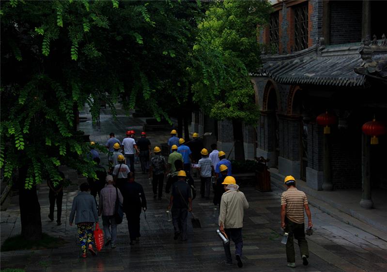 作品于2015年夏摄于山东台儿庄古城,清晨下着小雨,工人们正在前往古城修复点,对在台儿庄大战中留下来古城再次进行修复。